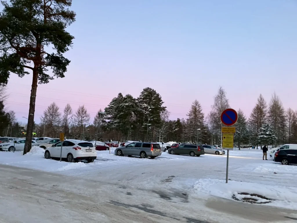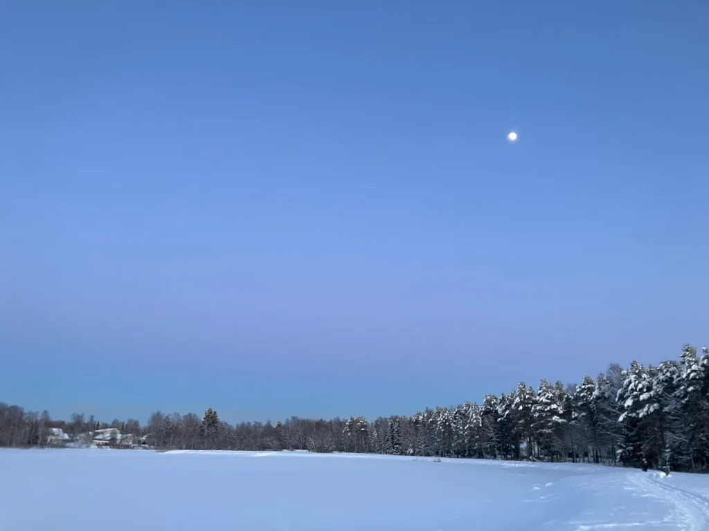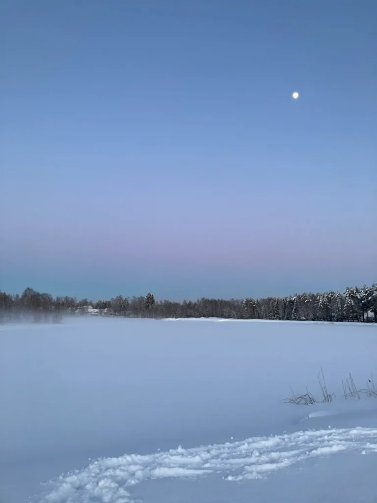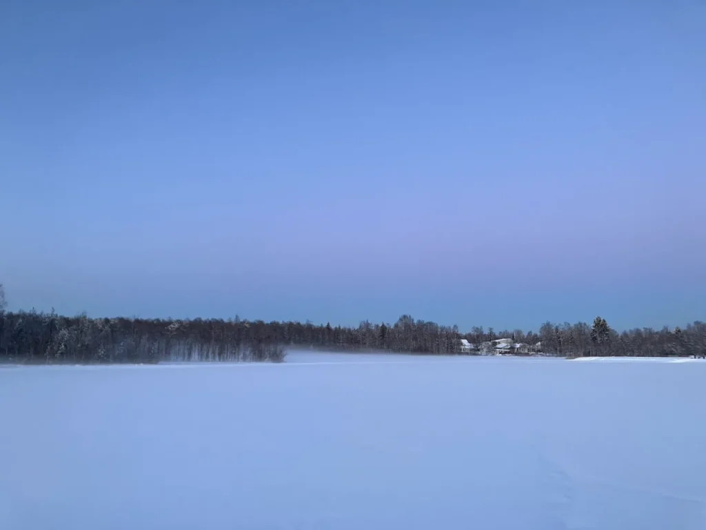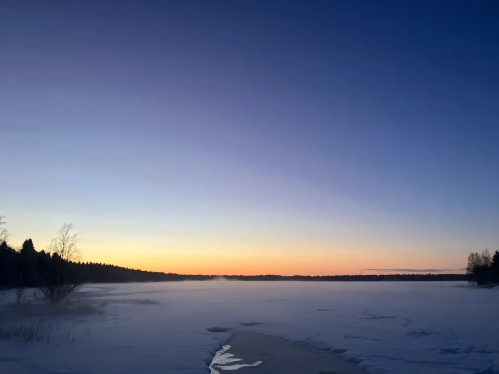 2月の夕方、オウルの湖畔を歩いていると、空にきれいなグラデーションが広がっていました。