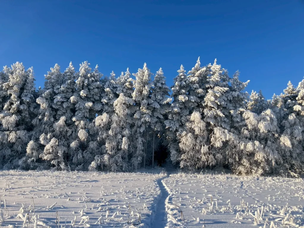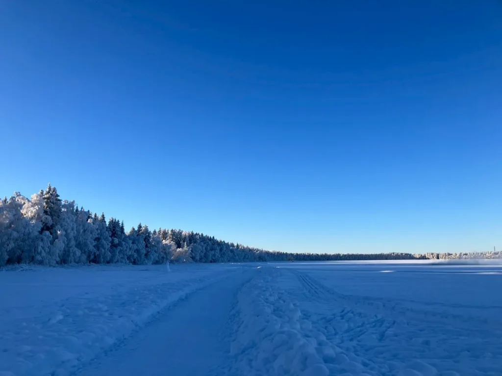 雪に覆われた森や凍った川など、フィンランド北部らしい冬の景色を見ることができます。