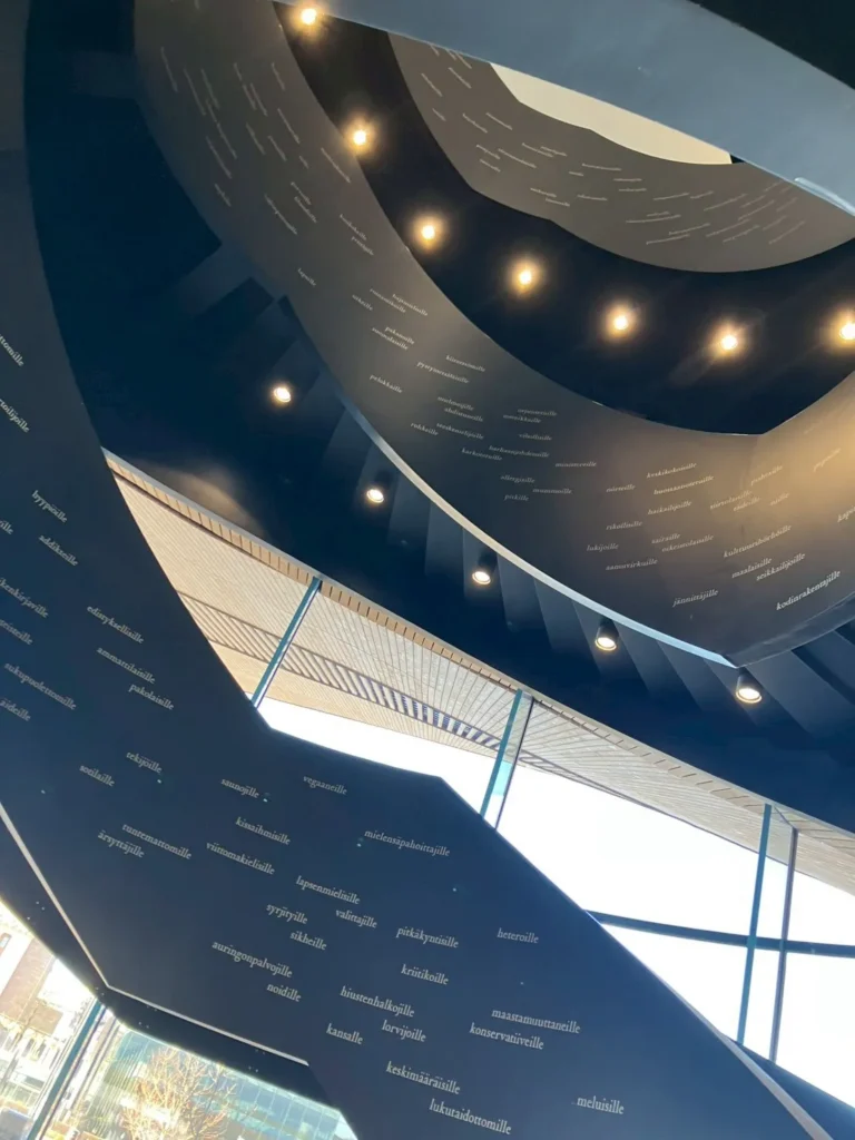 1階から2階、3階へと続く螺旋階段には、たくさんのフィンランド語が書かれています。