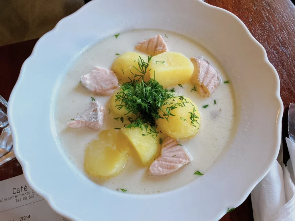 サーモンスープにはサーモンがたくさん入っていて、ディルの香りがします。
