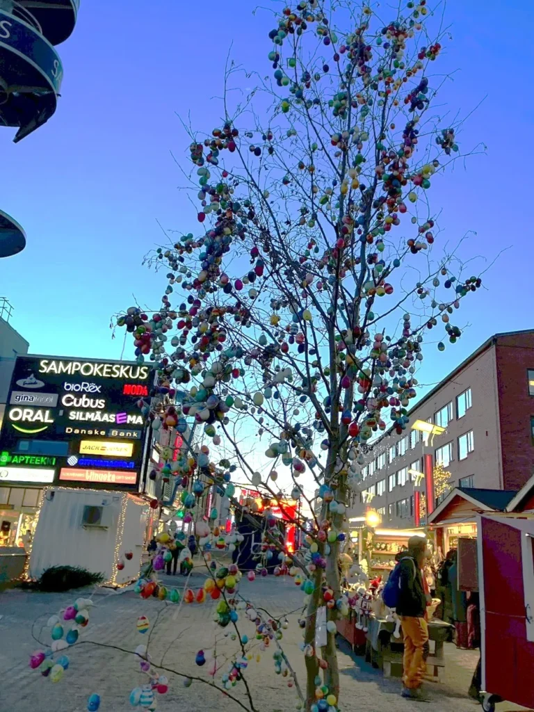 3月に訪れたロヴァニエミでは、街の木にカラフルな卵が飾られていました。