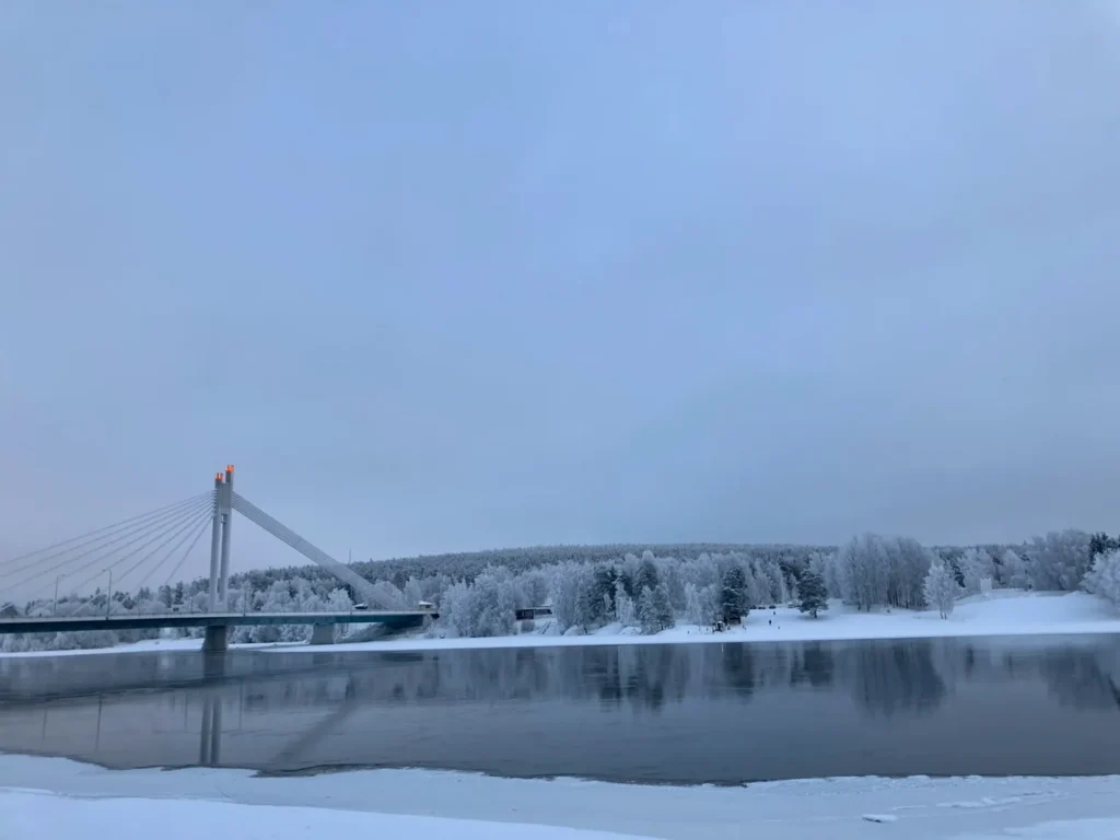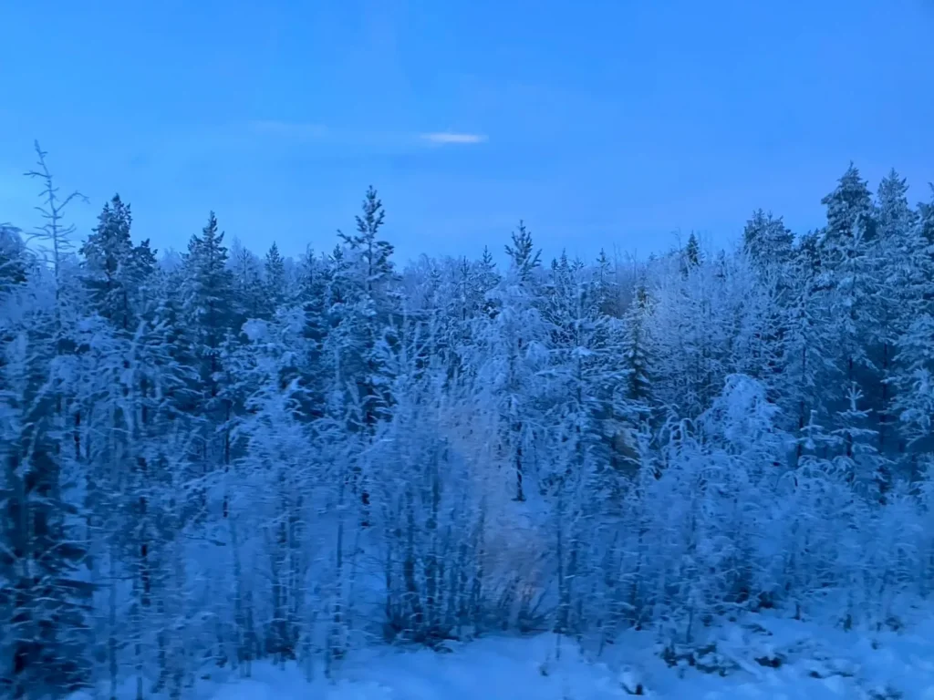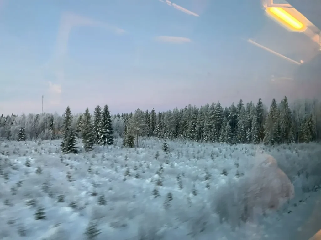 窓の外に見える広大な雪原や、氷と雪に覆われた木々は美しく、フィンランドらしい幻想的な風景でした。