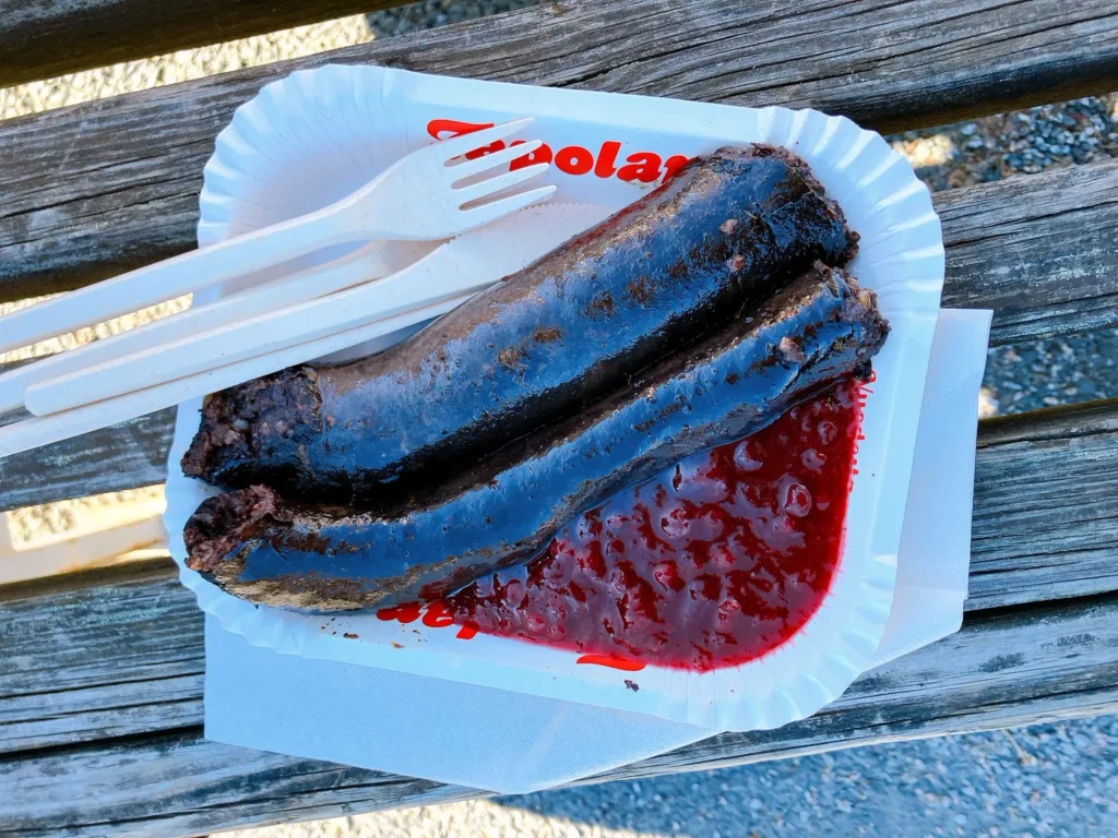 タンペレ名物の黒ソーセージ「mustamakkara(ムスタマッカラ)」は、豚肉・豚の血・ライ麦粉で作られ、リンゴンベリージャムを添えて食べます。